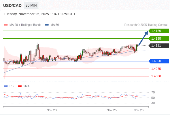 在 1.4090 之上,看涨,目标价位为 1.4135 ,然后为 1.4150 。