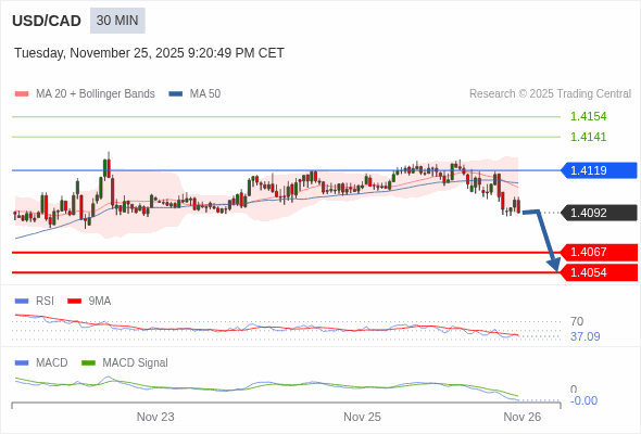 美元/加元 当日内 : 看跌,在 1.4119 之下。