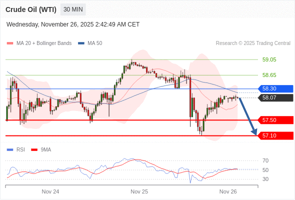 在 58.30 之下,看跌,目标价位为 57.50 ,然后为 57.10 。
