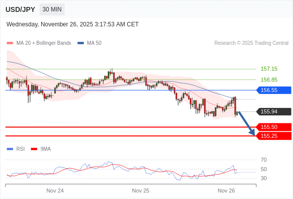 在 156.55 之下,看跌,目标价位为 155.50 ,然后为 155.25 。
