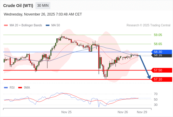 在 58.30 之下,看跌,目标价位为 57.50 ,然后为 57.10 。