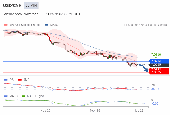 美元/人民币 当日内 : 看跌,在 7.0734 之下。