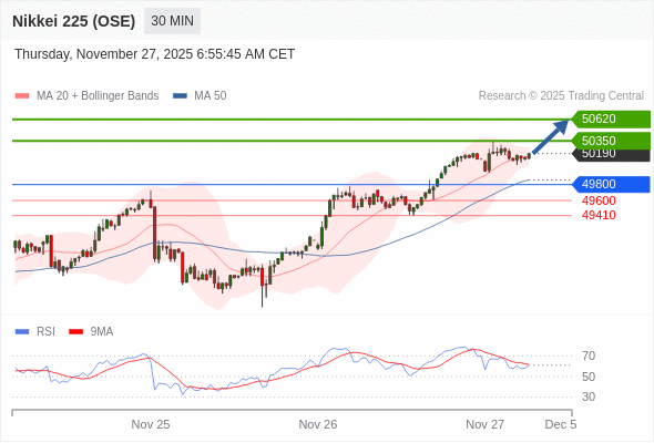 在 49800 之上,看涨,目标价位为 50350 ,然后为 50620 。