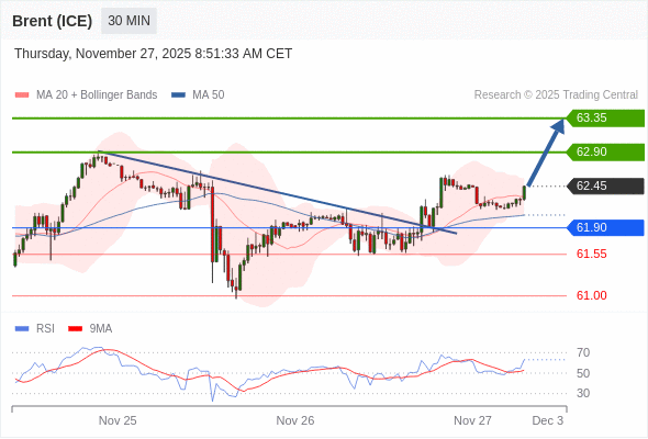 在 61.90 之上,看涨,目标价位为 62.90 ,然后为 63.35 。