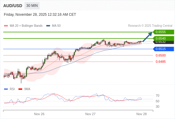 在 0.6515 之上,看涨,目标价位为 0.6540 ,然后为 0.6555 。