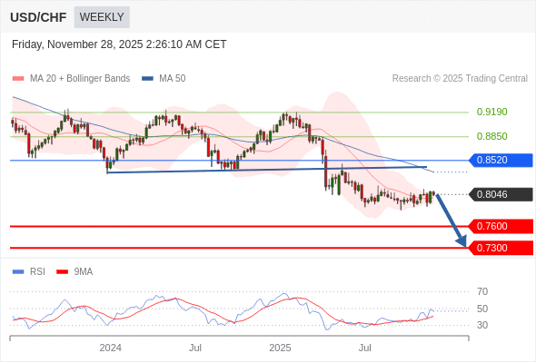 交易策略: 在 0.8520 之下,看跌,目标价位为 0.7600 ,然后为 0.7300 。