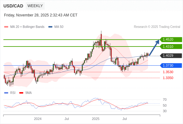在 1.3730 之上,看涨,目标价位为 1.4310 ,然后为 1.4520 。