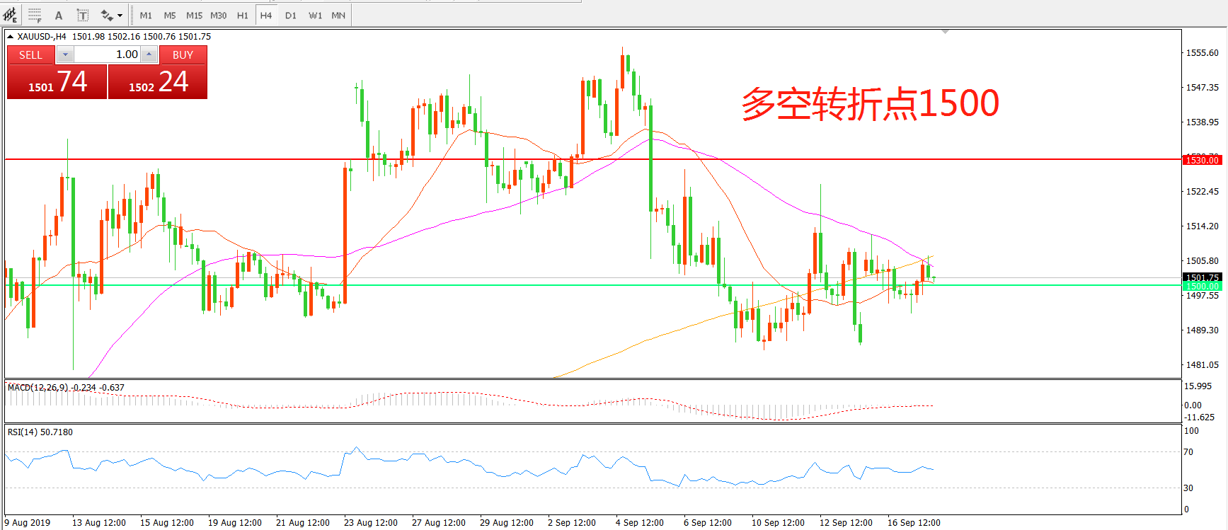 周二(9月17日)有消息指出,沙特接近恢复570万桶/日产量损失的70%,而沙特石油产量将在未来2-3周完全恢复,现货黄金闻讯下跌,随后又有消息称美国鉴定出导弹在伊朗发射的位置,美国副总统彭斯即将前往沙特,金价冲自低位反弹,最终收报1501.14美元/盎司。眼下,除了中东局势之外,市场的焦点主要聚焦美联储决议上,务必重点关注。