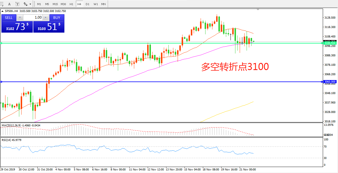 4小时图看,标普500维持高位震荡格局且振幅逐渐收窄,55周期均线成为短期支撑,整体来看依然处于多头趋势,但MACD红柱缩短,RSI指标走平,需警惕短期回落风险。