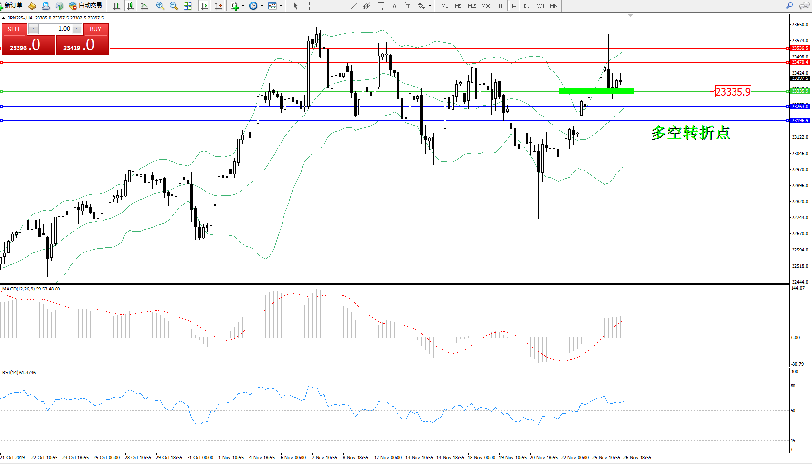 日经225指数11月26日(周二)收盘上涨82.19点,涨幅0.35%,报23375.00点。日本央行料会一直维持现行政策不变。此前预计日本央行会在下月进一步加大政策宽松力度。日本政府出台规模大于预期的一揽子财政刺激计划的可能是改变预期的最重要原因,而一揽子财政刺激计划的规模有可能超过6万亿日元(550亿美元)。若贸易谈判取得进展,日本央行的维持现状立场将得到进一步的巩固。然而,日元快速升值和经济疲软带来的通胀上行势头减缓会促使日本央行考虑祭出进一步的刺激措施。