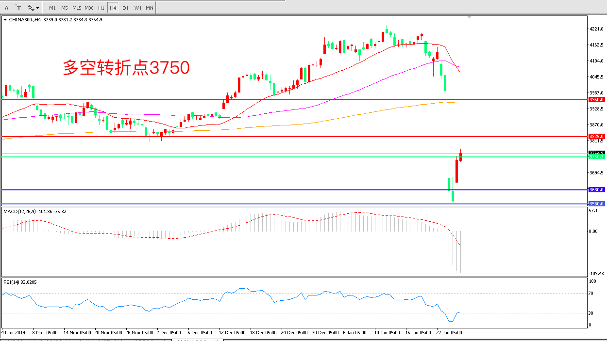 4小时图看,沪深跳空高开延续上行,整体走势有所回暖,3750成为短期多空分水岭,均线系统拐头向下,MACD红柱缩短,RSI指标向下,日内延续震荡概率较大。