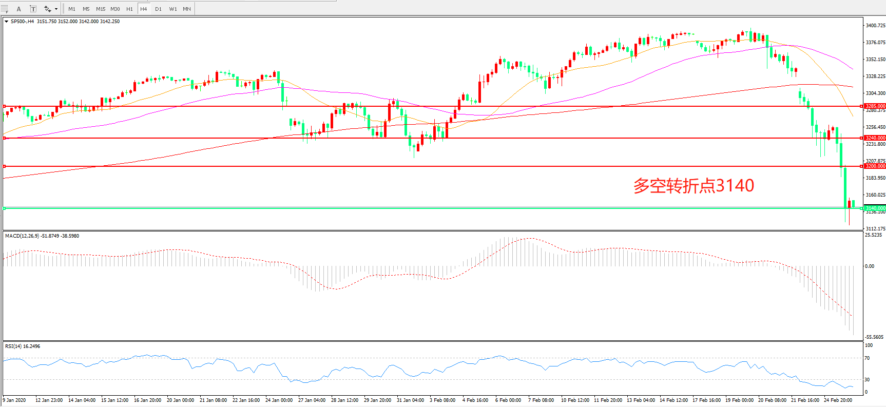 4小时图看,标普500低开低走,整体表现低迷,短期均线拐头向下,MACD绿柱增加,RSI指标向下,日内延续下行概率较大。