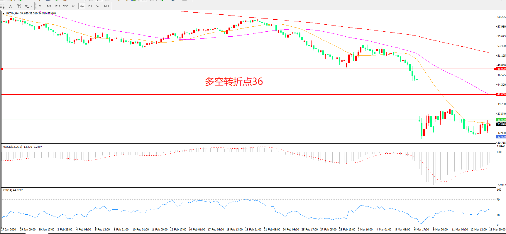4小时图看,布油延续低位震荡,整体波幅不大,36美元成为短期多空分水岭,均线系统呈空头排列,MACD绿柱减少,RSI指标走平,延续震荡概率较大,短期反弹有望出现,中期走势仍然偏空。