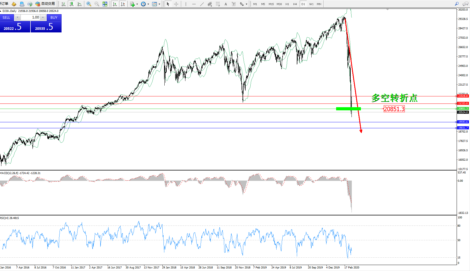 道琼斯指数DJ30—— 日K线图显示: