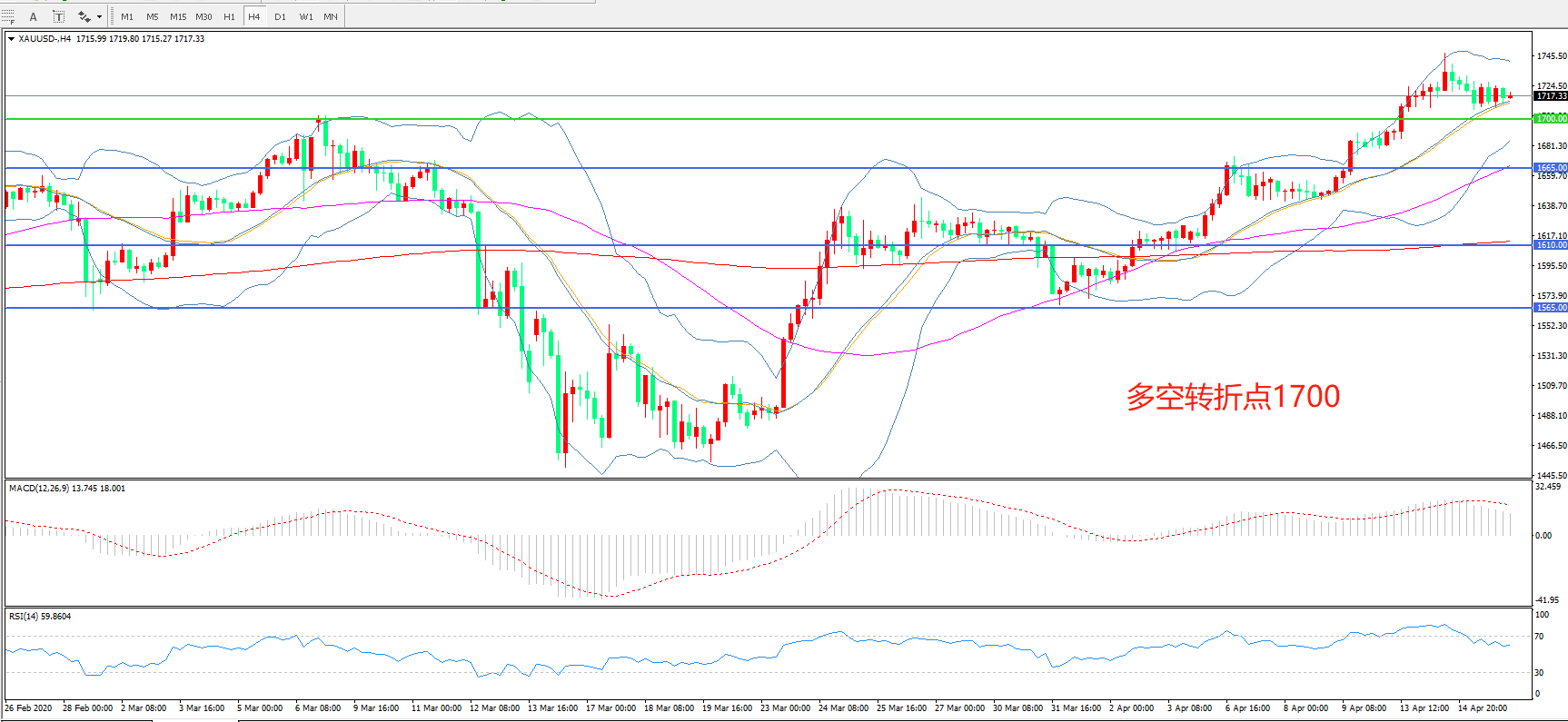 周三(4月15日),由于美元走强和投资者获利了结,现货黄金小幅下行,收报1718.13美元/盎司。国际货币基金组织发表报告,预测全球经济今年将萎缩3%,并可能进入自1930年代大萧条以来最严重的衰退。但从近几日黄金表现来看,金价已经确认突破了1700美元关口,巩固了市场对于金价在中短期内进一步上涨的预期。