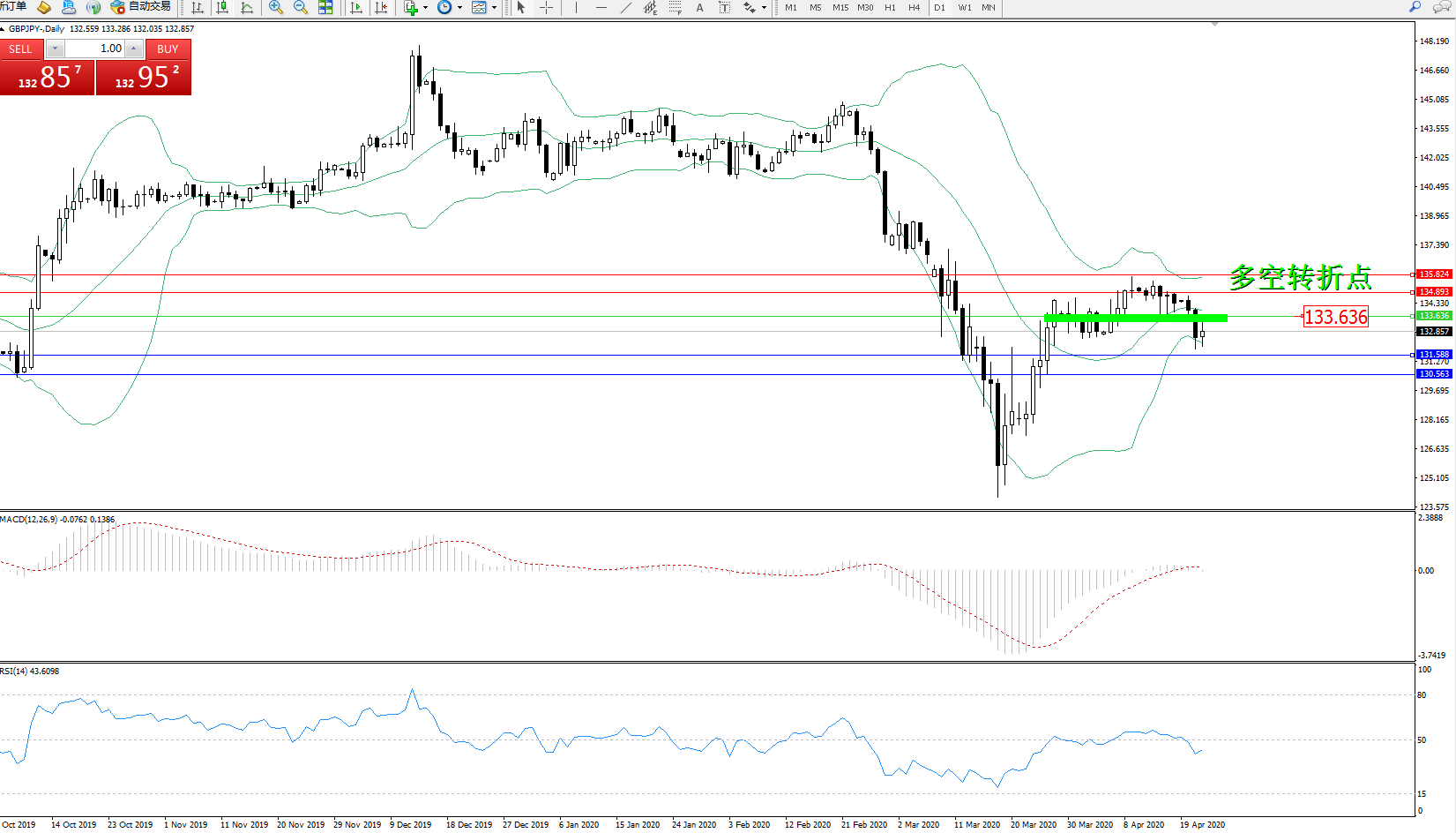 技术点评:高位空头动力弱势缓慢下移中,处于布林带指标中下轨区间弱势震荡,有继续下行态势,布林带指标呈收口走势后,有再次张口迹象,关注中轨133.636附近节点,MACD指标处于0轴线附近弱势徘徊平移中,RSI指标空头动力弱势下破50均衡线进入空头区域震荡向下移动中;