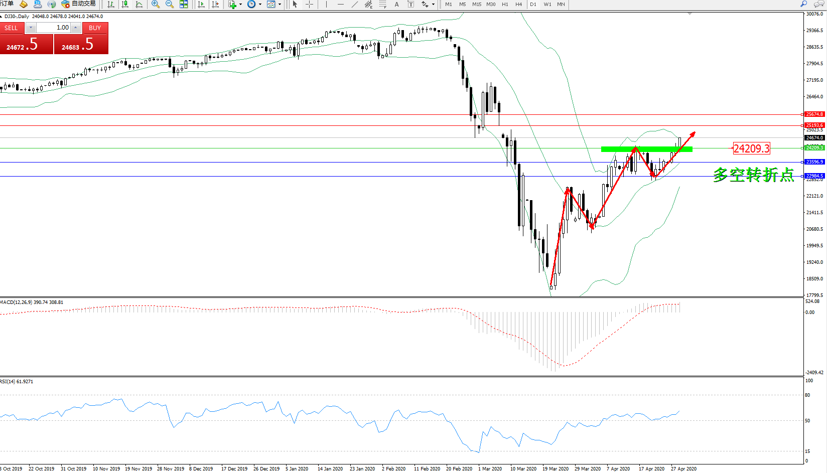 道琼斯指数4月29日(周三)收盘上涨532.30点,涨幅2.21%,报24633.86点。美国股市升至七周高点,新冠特效药出现希望。推动市场的因素是任何潜在新冠药物和疫苗的正面消息,因为这将是重大转折,再加上有关提前解封的消息,这都会推动市场。美元指数下跌0.45%至99.53,美联储宣布政策决定后,该指数触及盘中低点。周三早些时候发布的数据显示,这个全球第一大经济体第一季度国内生产总值(GDP)折合年率萎缩4.8%,为2008年以来最大下滑,也是2014年以来经济首次萎缩。
