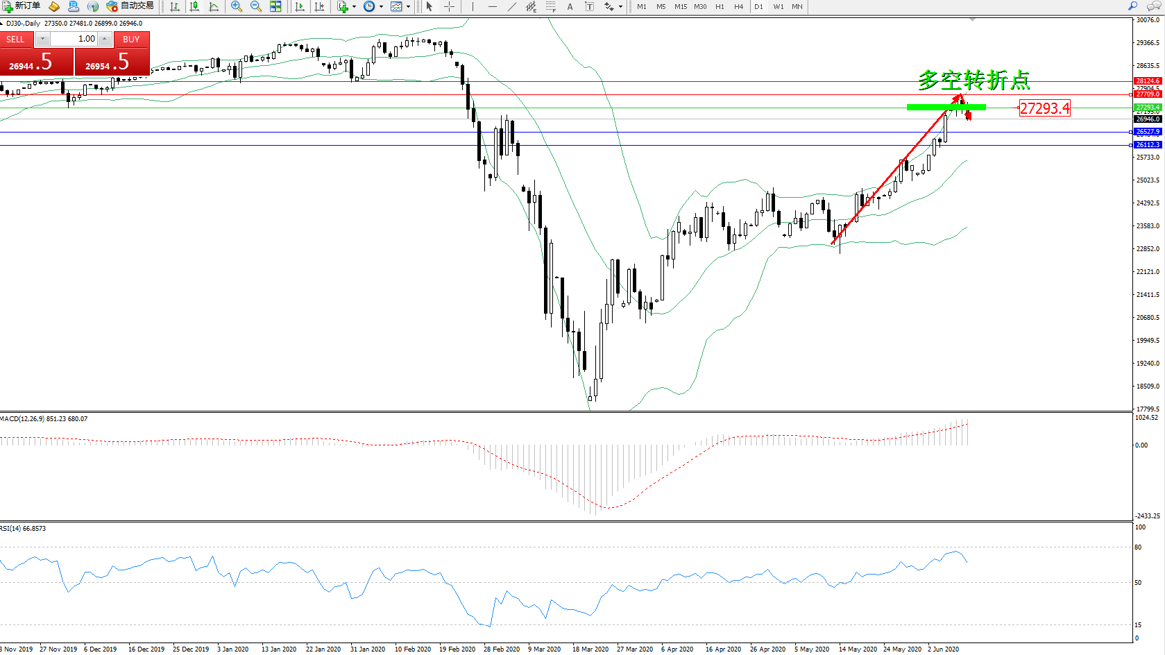 道琼斯指数6月10日(周三)收盘下跌282.30点,跌幅1.04%,报26989.99点。美联储决策者预计利率政策将保持不变到2022年;美联储声明发表后,美联储主席鲍威尔暗示新冠病毒疫情可能给美国经济造成永久性伤害。美国股市自3月份触及的低点已经上涨逾40%,美联储的空前刺激措施提振风险偏好。在美联储没有推出任何新措施之后,投资者似乎在获利了结,目前不宜承担风险。美联储周三重申了将继续为经济提供非常规支出的承诺,同时政策制定者预计今年国内生产总值(GDP)将萎缩6.5%,年底失业率将达到9.3%。