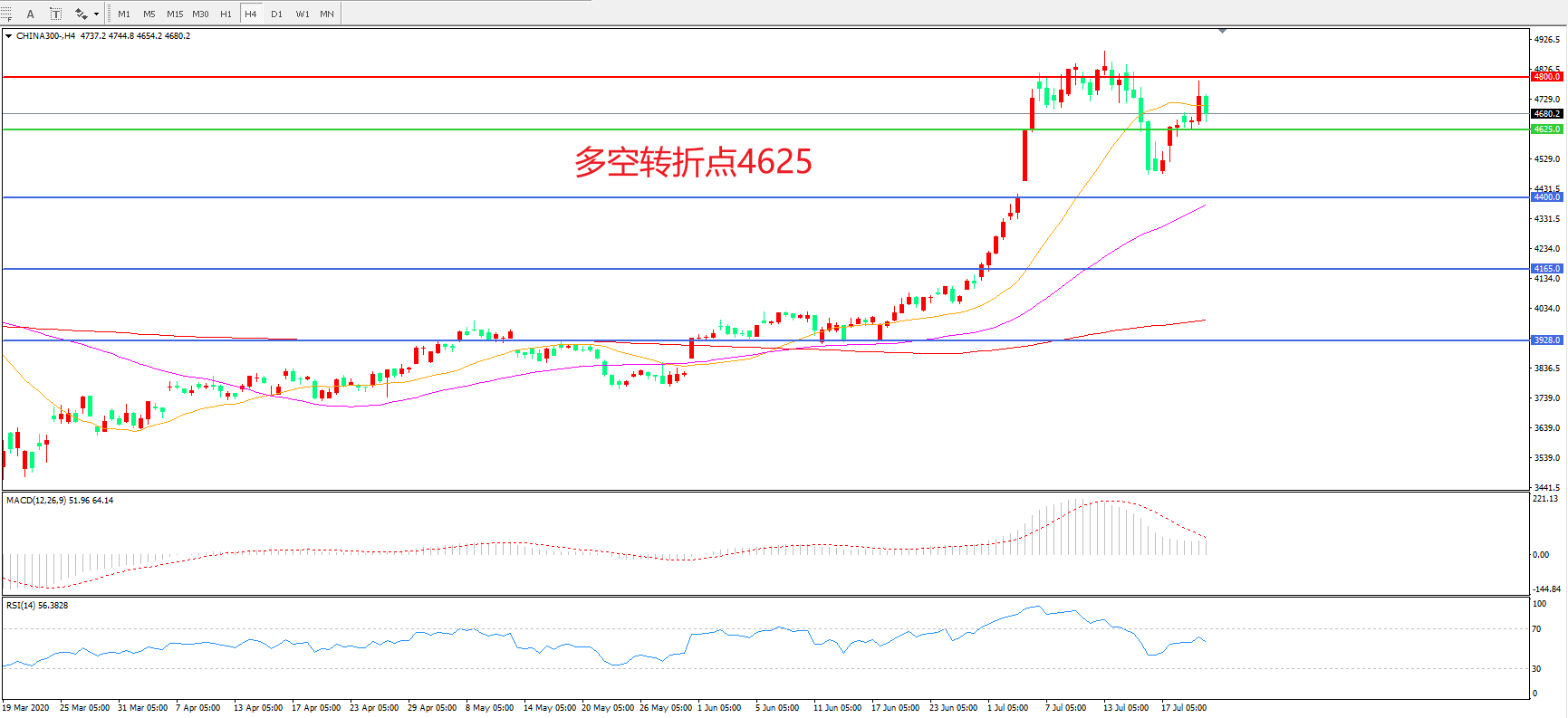 4小时图看,沪深300冲高回落,整体呈现高位震荡走势,均线系统逐渐发散,4625成为短期支撑, MACD红柱增加,RSI指标向上,日内延续震荡概率较大。