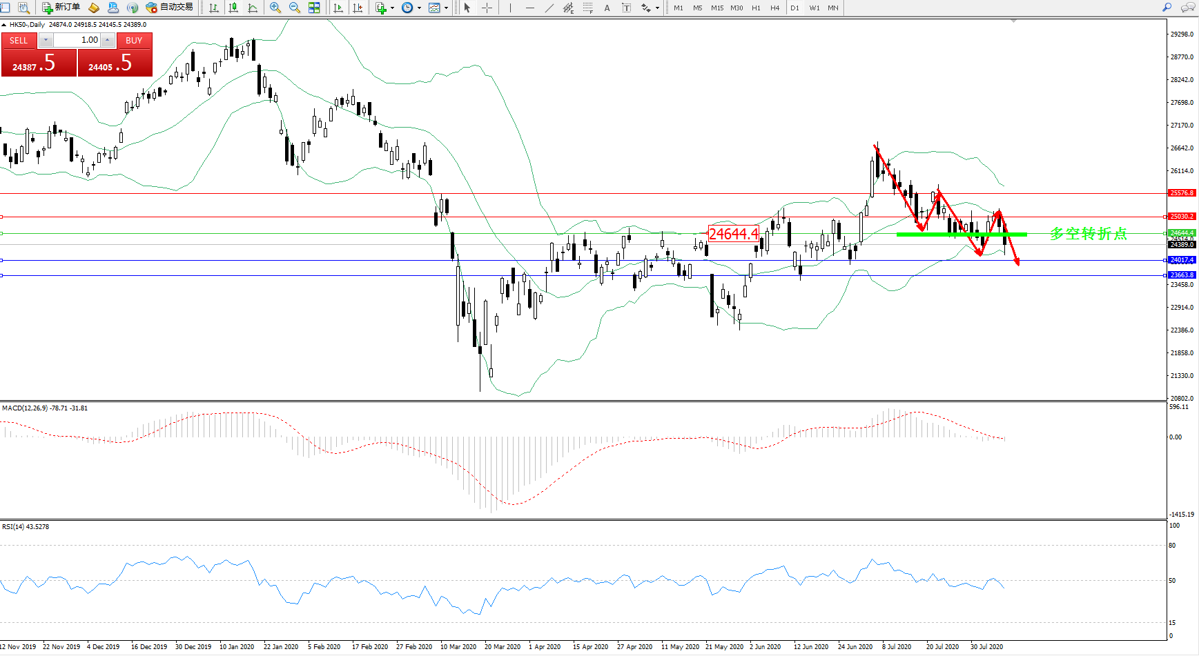 技术点评:高位空头动力持续呈阶梯式震荡回撤下移,触及布林带指标下轨附近虽有短暂反转上移,但空头动力强劲,多头反攻未能如愿拉升,再度下挫至布林带指标下轨附近,布林带指标呈空头转势下行持续中,且处于中下轨区间不断向下移动态势良好,MACD指标空头动力下行破0轴线进入空头区域持续整理徘徊中,RSI指标处于50均衡线下方空头区域维持震荡下移中;