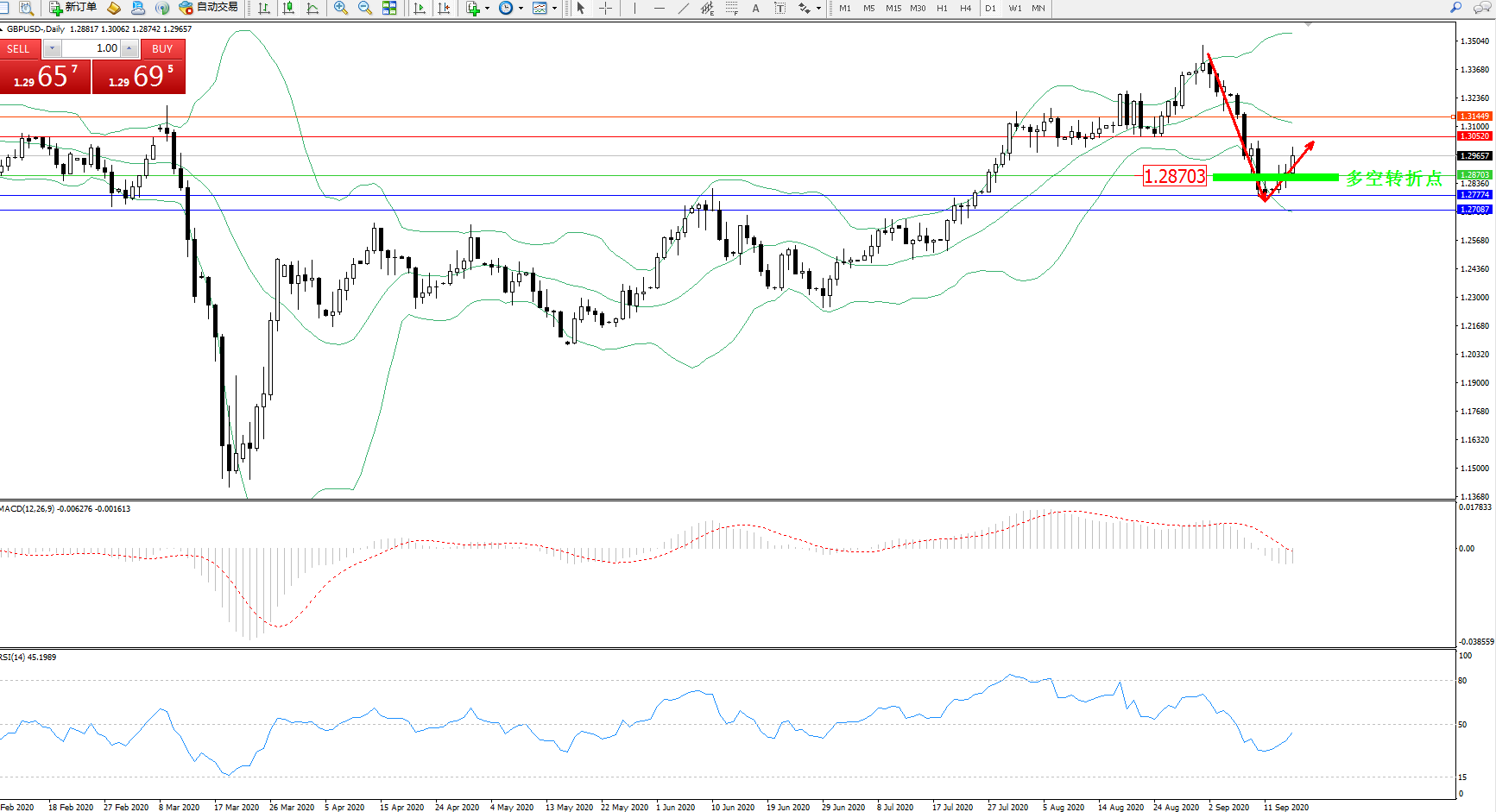交易策略:1.28703上方看涨,目标1.30520、1.31449
