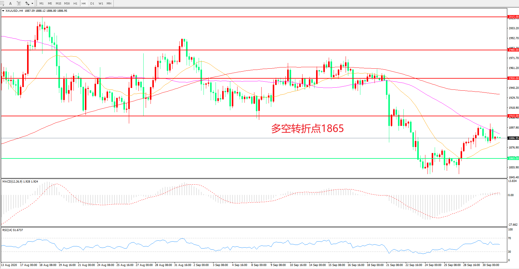 周三(9月30日),好于预期的“小非农”数据公布后,美元指数短线急跌,现货黄金短线拉升12美元后小幅回落,最终收报1888美元/盎司。目前对黄金有利的一面是,市场不确定性在增加,更多的人会想要持有黄金,而不利的一面是美元指数震荡反弹,压制了金价的上行走势。