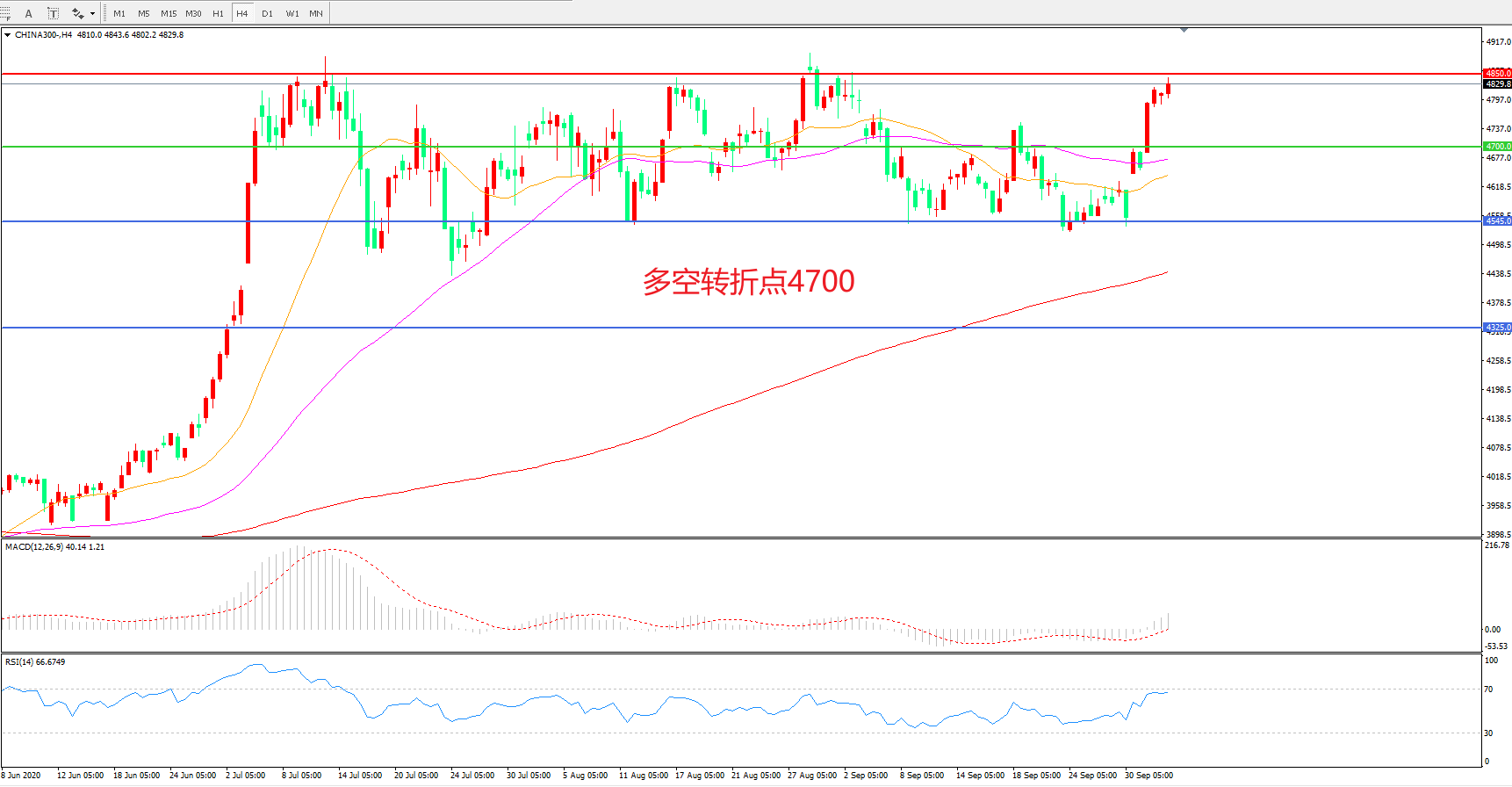 4小时图看,沪深300延续震荡上行,短期走势依然偏强,4850成为上方短期阻力,均线系统走平, MACD红柱增加,RSI指标向上,日内延续上行概率较大。
