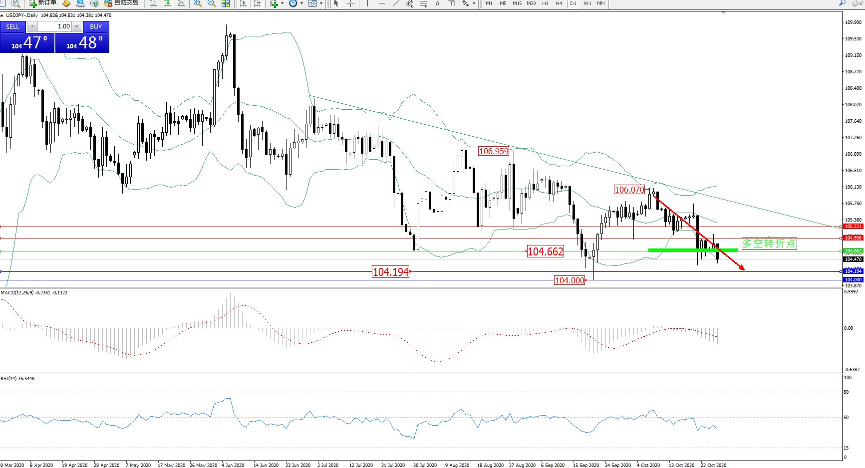 技术点评:空头动力延续布林带指标通道下轨附近弱势震荡向下移动态势良好,布林带指呈张口走势中,跌势依旧,前期低位104附近近在咫尺,破位在即,MACD指标处于空头区域低位弱势整理后持续向下移动中,RSI指标处于空头区域低位维持整理平移中;