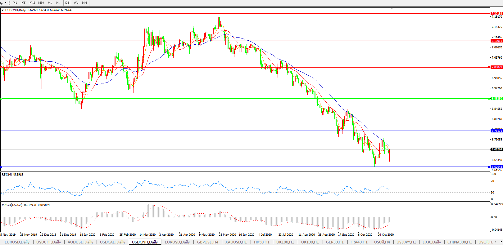 美元兑人民币USDCNH 日线图: