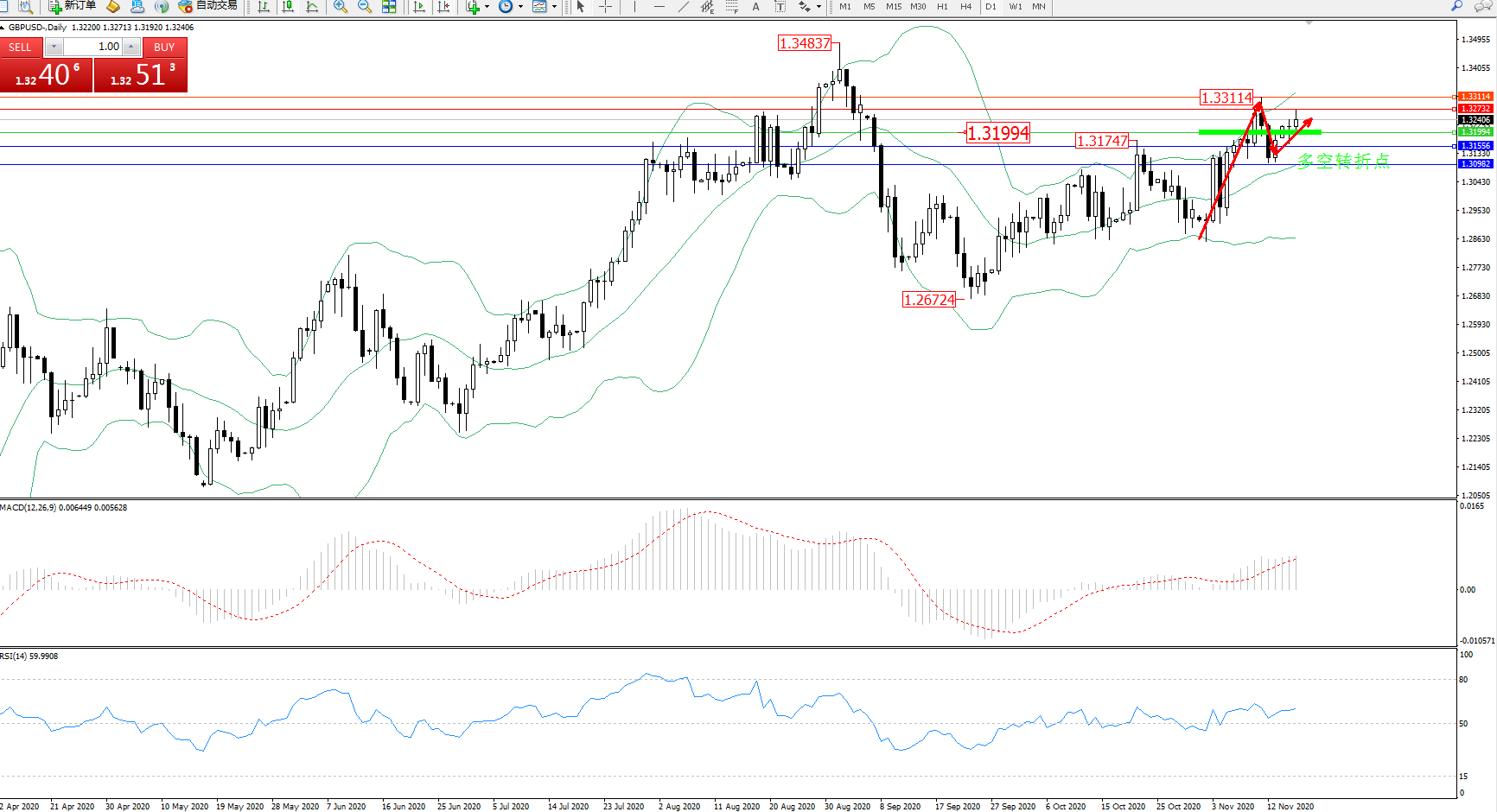 交易策略:1.31994上方看涨,目标1.32732、1.33114