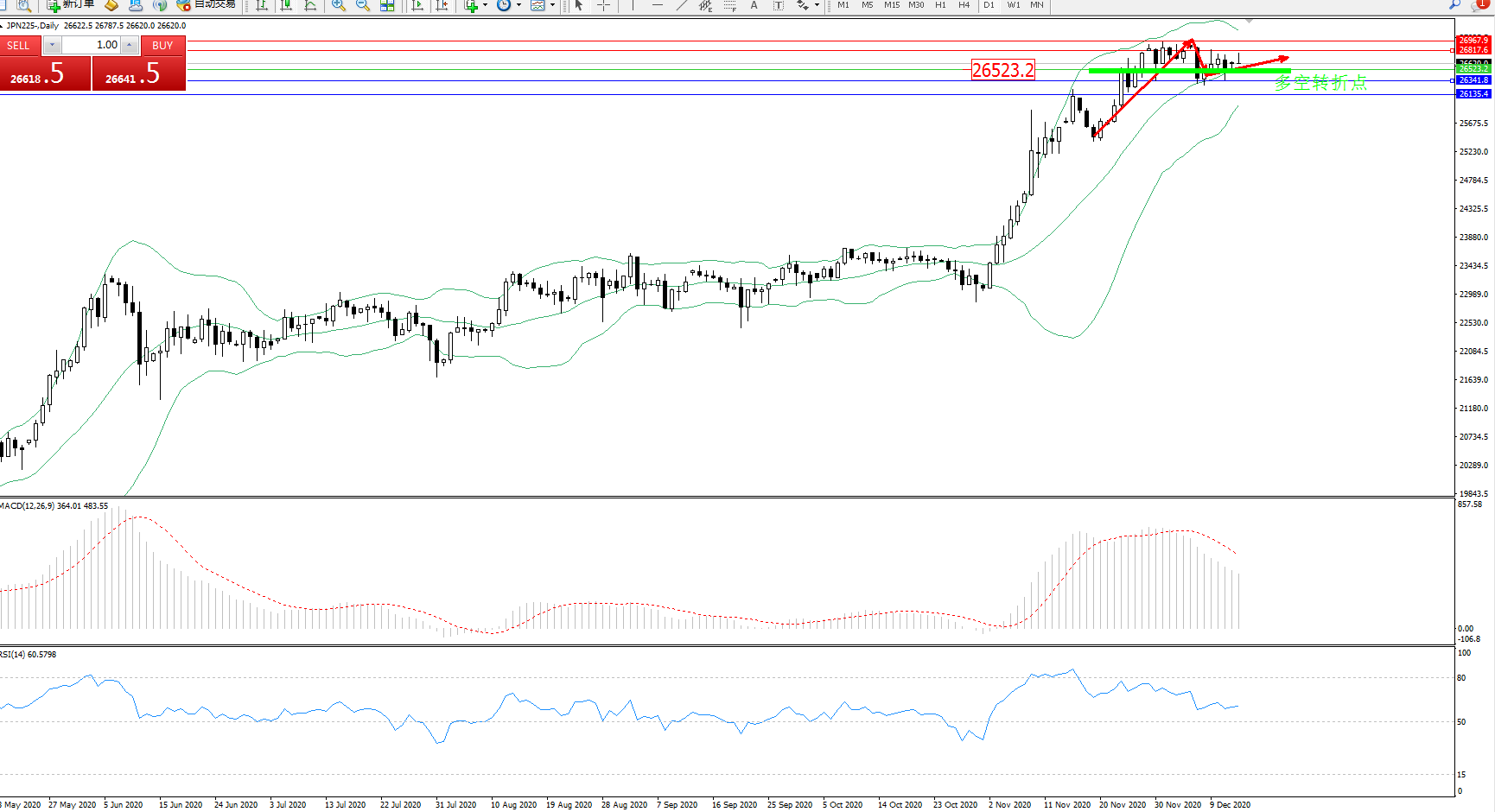 日经225指数12月14日(周一)收盘上涨84.48点,涨幅0.32%,报26737.00点。日本央行短观调查显示,日本第四季度企业信心连续两季度呈现好转,经济持续走出新冠疫情打击的迹象令人感到宽慰。但是最近疫情反扑,企业削减其本财年资本支出计划,越发使人觉得这个全球第三大经济体的复苏将是脆弱的。9月调查中,大型企业计划将资本支出提高1.4%,市场预估12月的调查中企业支出将减少0.2%。日本央行周五将结束为期两天的政策会议,该数据将是其密切关注的几个主要因素之一。预计日本央行将暂不扩大刺激计划,但考虑将一系列旨在缓解企业融资困境的措施延长至明年3月以后。