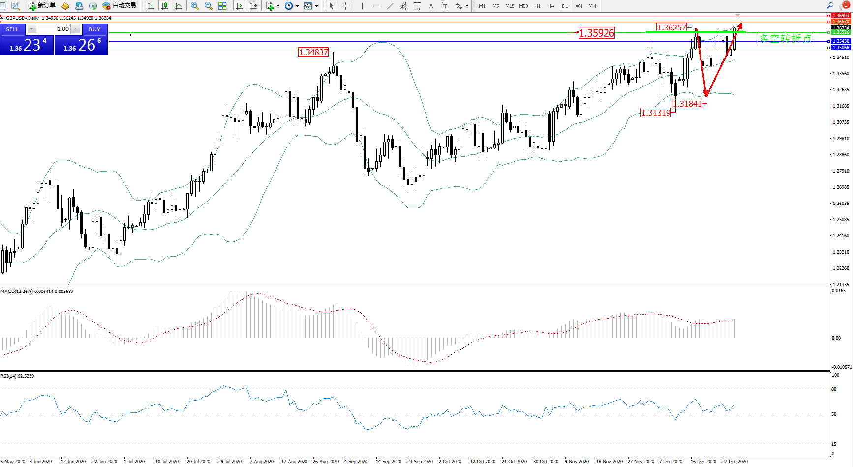 交易策略:1.35926下方看跌,目标1.35430、1.35068