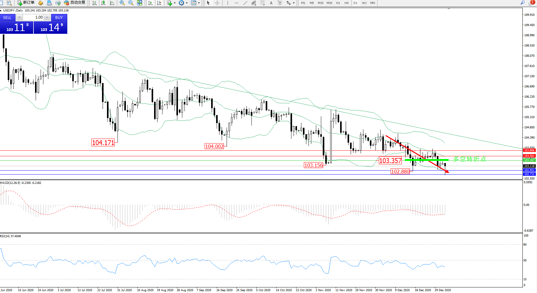 技术点评:空头动力延续布林带指标通道内中下轨区间持续震荡下行态势良好,底部抵达102.880位置后得到短暂支撑开始回升,但多头上扬动力欠缺,再度持续下行,纠结于布林带指标中下轨区间整理,布林带指标呈收口走势持续向下移动中,MACD指标处于0轴线下方空头区域维持整理平移中,RSI指标处于50均衡线下方空头区域维持窄幅整理有继续下移迹象;