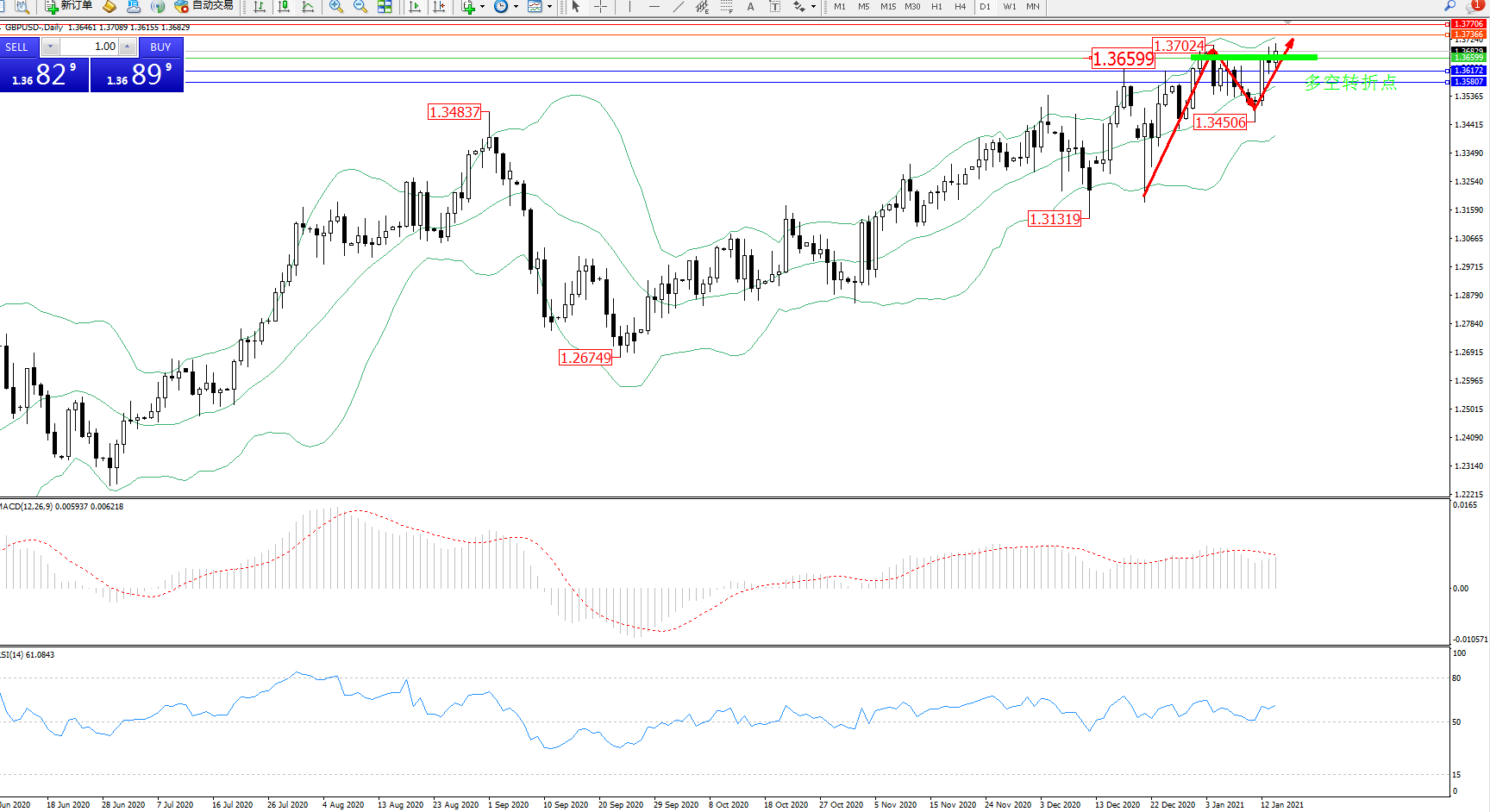 交易策略:1.36599上方看涨,目标1.37166、1.37706