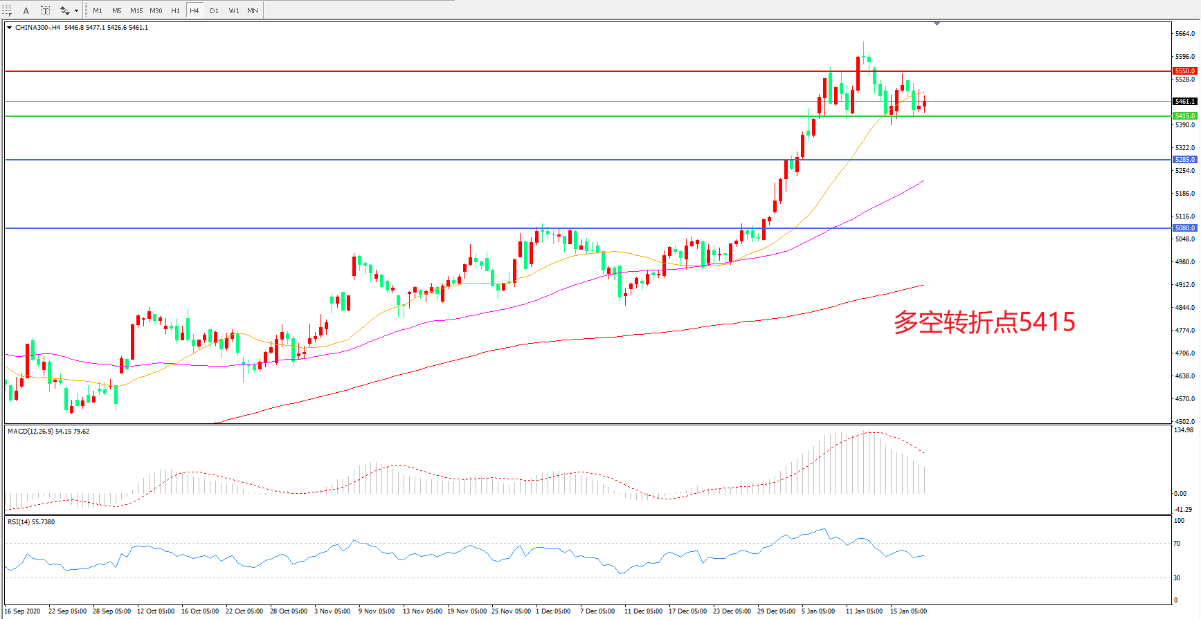 4小时图看,沪深300冲高回落后陷入震荡,短线有形成头肩顶可能,5415成为短期支撑,5550成为上方阻力,均线系统逐渐走平,MACD红柱缩短,RSI指标走平,日内延续震荡概率较大。