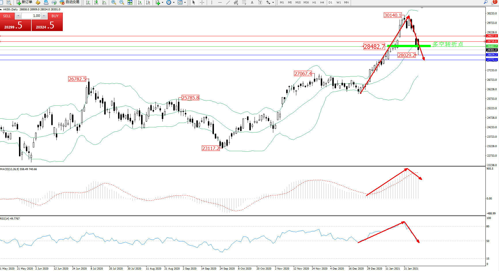 技术点评:多头动力延续布林带指标通道上轨附近持续震荡上扬至30140附近遇阻,开始反转急速下挫至布林带指标中下轨区间28029附近节点后得到短暂支撑,处于中轨下方附近窄幅整理中,布林带指标呈收口走势持续中,空头动力有继续下行态势,MACD指标处于多头区域高位震荡回撤走势持续,RSI指标高位空头动力震荡回撤至50均衡线附近徘徊中;