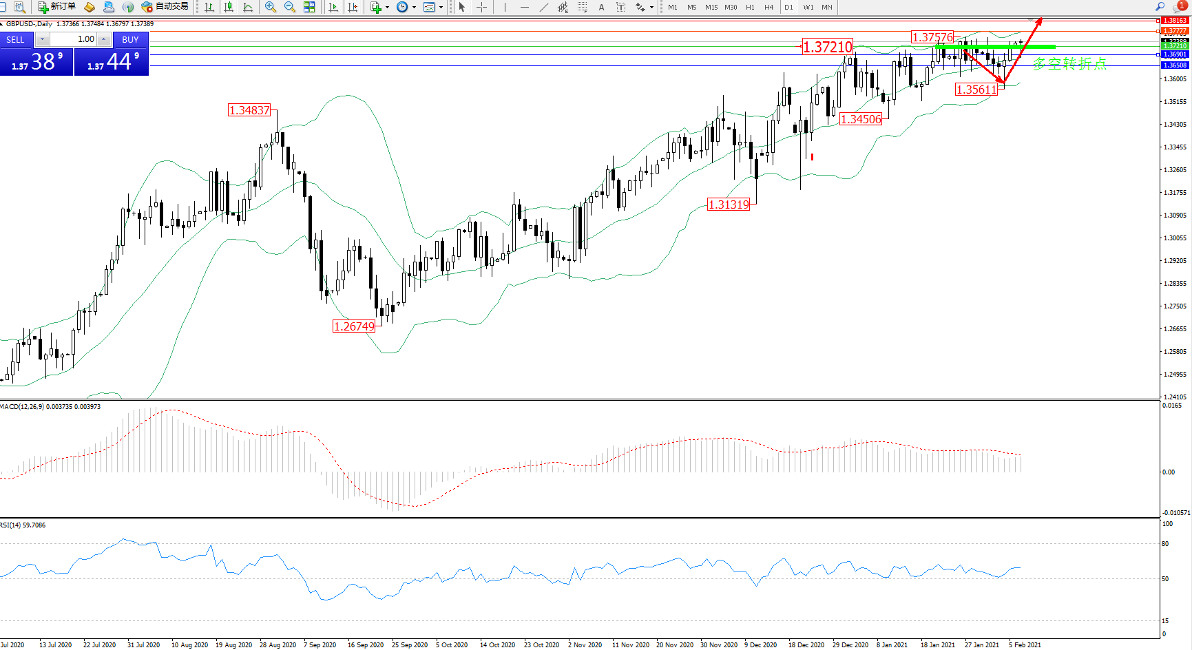 交易策略:1.37210上方看涨,目标1.37777、1.38163