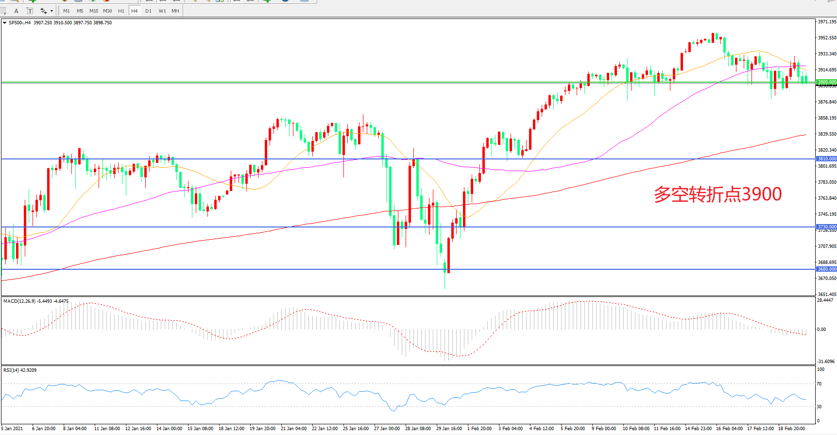 4小时图看,标普500延续高位震荡,整体波幅不大,3900成为短期多空分水岭,均线系统逐渐走平,MACD红柱缩短,RSI指标向下,日内延续震荡概率较大。