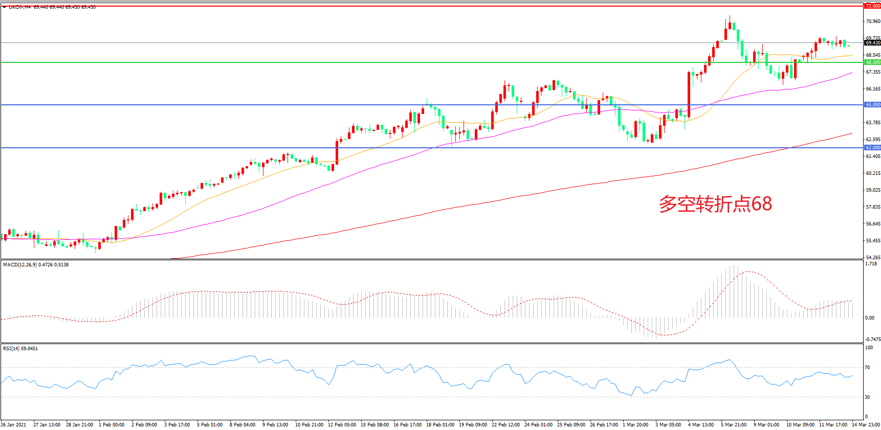 4小时图看,油价回踩55周期均线后震荡反弹,短期走势有所回暖,68美元成为下方支撑,72美元成为短期阻力,MACD红柱缩短,RSI指标走平,日内震荡上行概率较大。