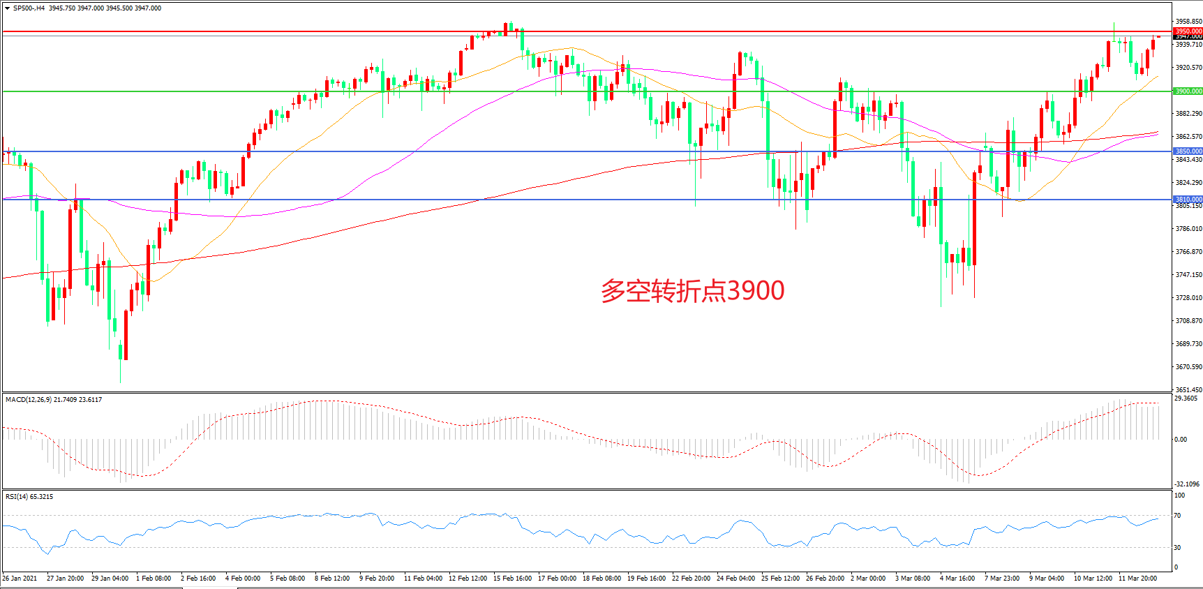 4小时图看,标普500长阳拉升,短期走势有所回暖,21周期均线系统成围下方支撑,3900成为多空分水岭,MACD红柱增加,RSI指标走平,日内震荡上行概率较大。