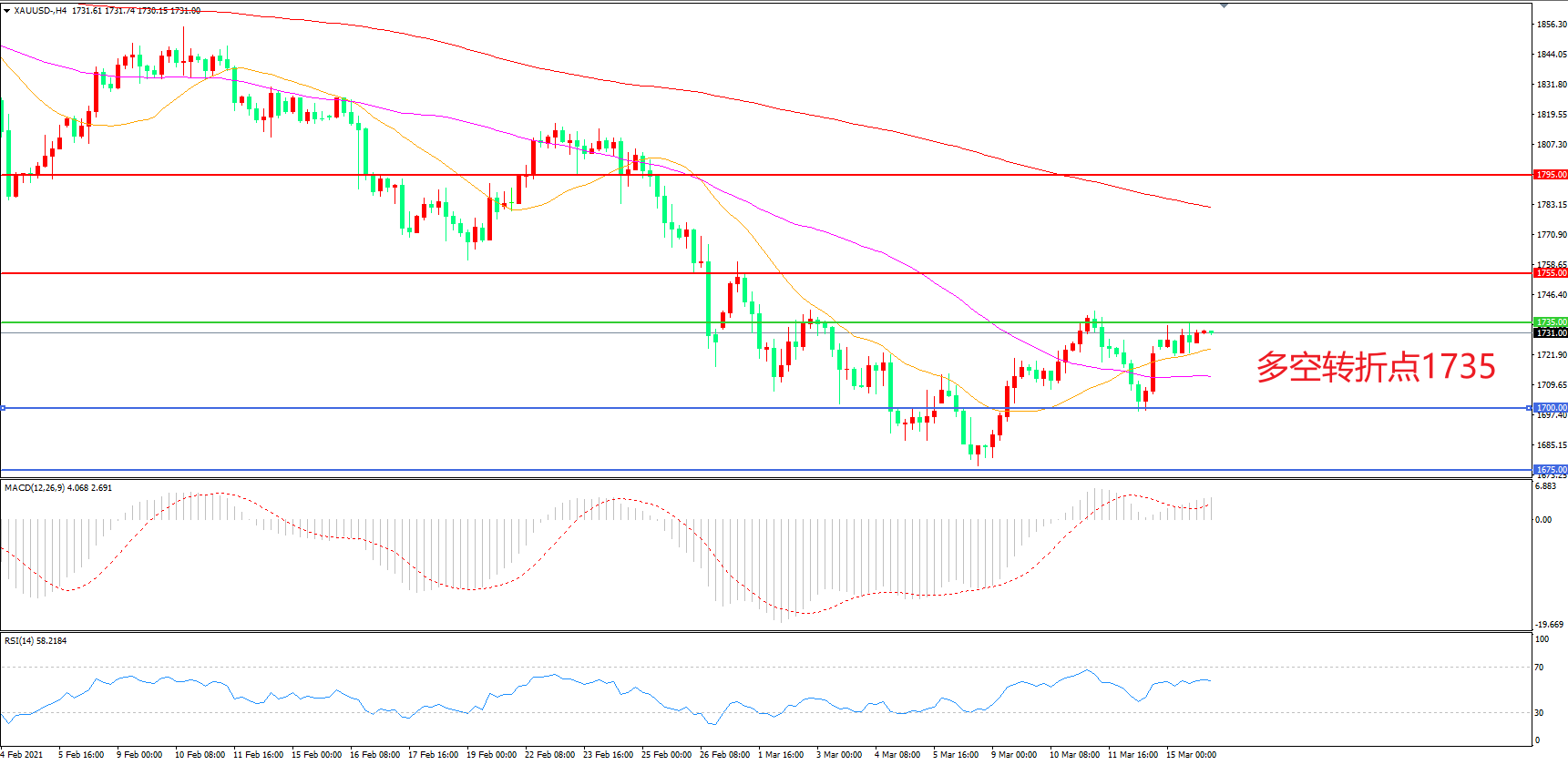 周一(3月15日),市场静候本周会后美联储公布最新货币政策决议,美国10年期国债收益率迎来大跌,美元指数震荡反弹,多空交织之下,金价延续窄幅震荡走势,收报1730.15美元/盎司。自上次美联储会议以来,美国债券收益率已上涨约60个基点。尽管有人预期,美联储可能会试图安抚债券市场,但普遍看法是,美联储主席鲍威尔不会改变政策。同时,英国央行和日本央行将于本周召开会议,可能为全球利率走向定下基调。