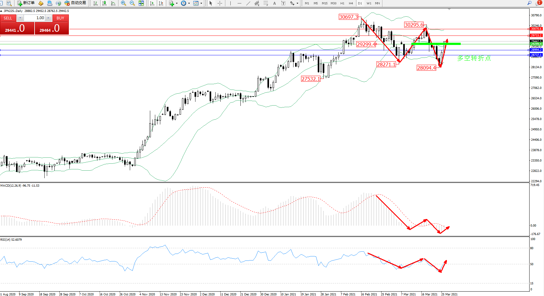技术点评:高位空头动力维持在布林带指标通道宽幅震荡向下移动,低位抵达28094位置节点后得到支撑开始反转上移,突破中轨进入中上轨区间震荡,多头动力有急速反攻态势,关注中轨附近节点,MADC指标空头动力下行后长时间纠结于0轴线附近长时间维持震荡,RSI指标处于50均衡线震荡后低位开始缓慢回升;