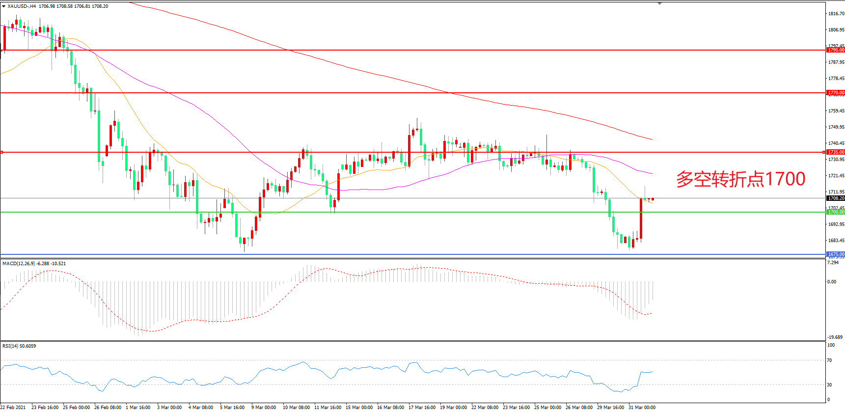 周三(3月31日),在拜登公布包括基建在内的重大经济刺激方案时,10年期美债收益率暂时脱离前一日所创的14个月高位,上升势头放缓,美元指数也止住了连日上涨的势头,现货黄金迎来久违的反弹,涨逾2%后收报1708.28美元/盎司。根据最新公布的“小非农”ADP显示美国3月份新增就业人数达到6个月最高,如果周五非农的数据表现与此一致,市场有望迎来更大行情。
