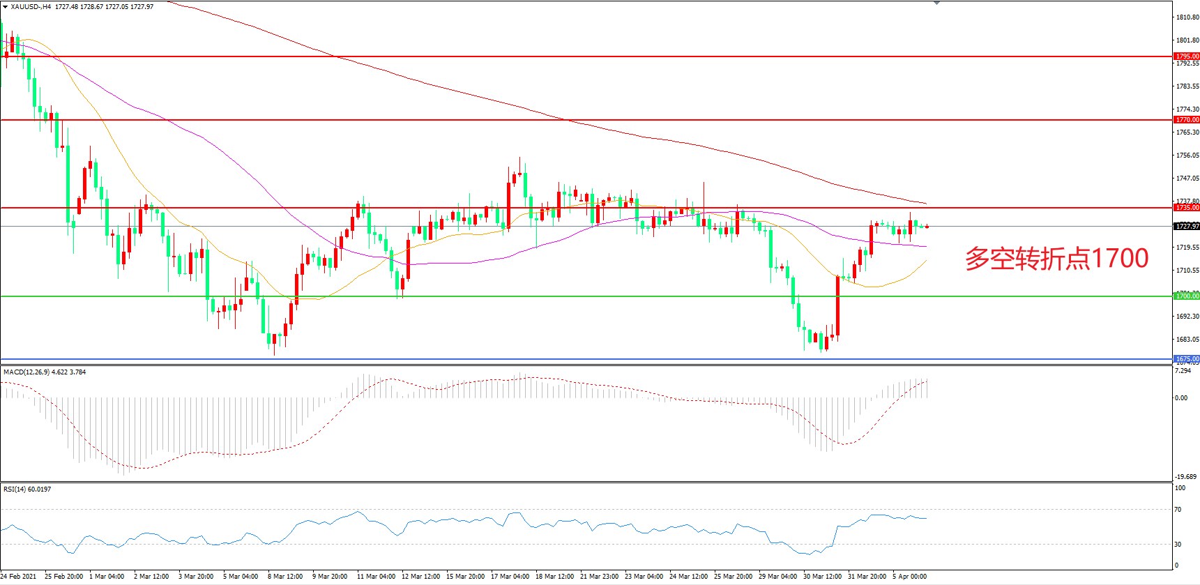 4小时图看,金价回踩1675后大幅反弹,1700关口被突破后,短期走势回暖,200周期均线成为上方阻力,1735成为短期多空分水岭,MACD红柱增加,RSI指标走平,日内震荡上行概率较大。