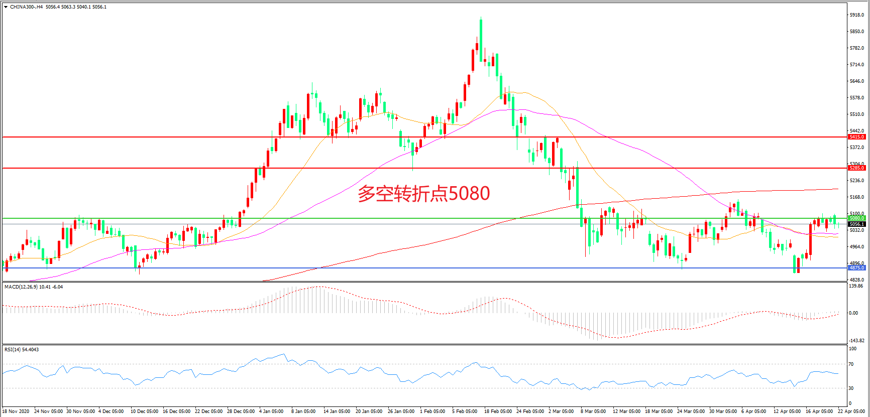 4小时图看,沪深300长阳拉升后陷入高位震荡,短期表现依然较强,均线系统阻力被顺利突破,5080成为多空分水岭,MACD绿柱减少,RSI指标走平,日内如能再度突破,有望开启新一轮上涨行情。