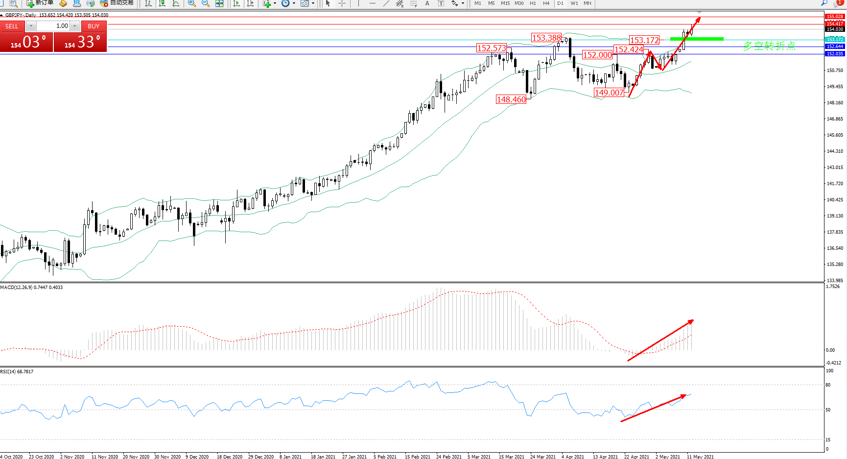 技术点评:长时间维持在布林指标通道宽幅震荡整理持续平移中,延续中上轨区间持续震荡向上移动态势良好,突破前期高位153.388位置后有继续拉升态势,布林带呈张口走势中,MACD指标处于0轴线上方弱势向上移动中,RSI指标处于50均衡线上方震荡拉升中;