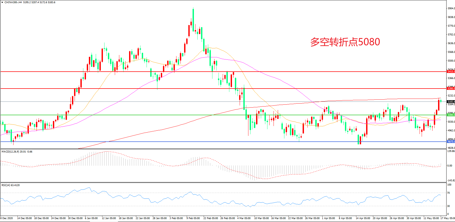 4小时图看,沪深300阳线连续拉升,短线走势有所回暖,均线系统形成的阻力的被突破,5080成为多空分水岭,200均线成为上方阻力,MACD红柱缩短,RSI指标向上,日内震荡向上概率较大。