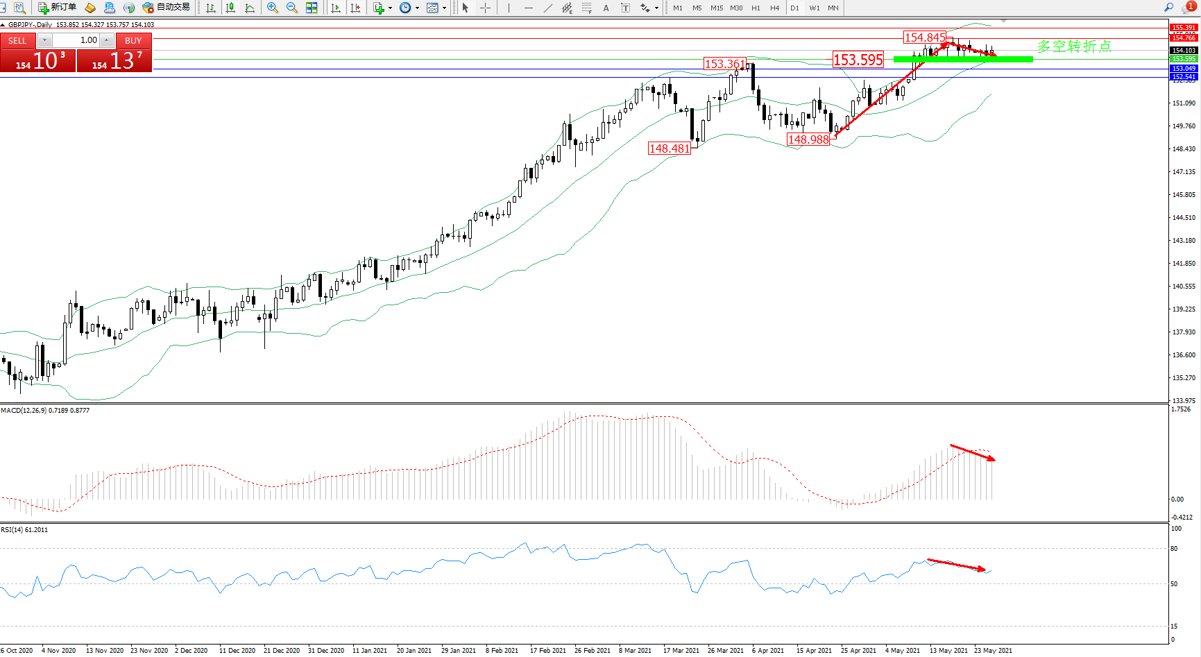 技术点评:多头动力延续布林带指标通道中上轨区间持续震荡上移,高位抵达154.845位置附近遇阻整理回撤,即将触及中轨附近节点,布林带指标呈张口走势后有短暂收口迹象,MACD指标处于多头区域弱势整理徘徊有下移迹象,,RSI指标处于多头区域高位平缓下移中;