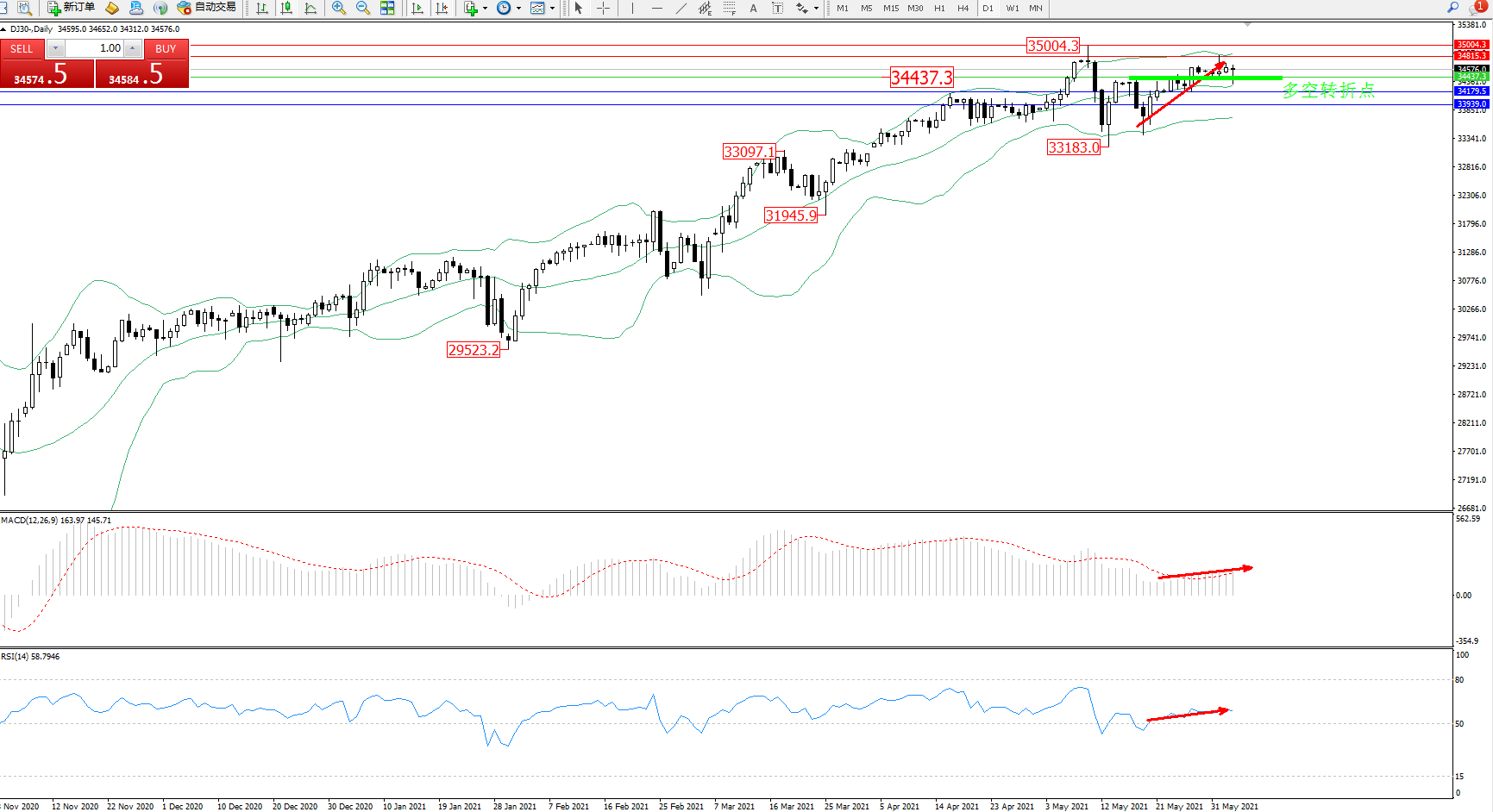 道琼斯指数6月3日(周四)收盘下跌23.40点,跌幅0.07%,报34576.98点;美股收盘,道指小幅收跌,美国5月ADP就业人数实际公布97.80万,远超预期值65万,增幅创去年6月以来新高。近期美元两次试图上攻,均无功而返,不过在经历了4月非农的低迷之后,5月非农有望迎来转机。ADP作为非农的先行指标,似乎预示着非农数据的强劲。加之美元指数近期来到强支撑位,市场看空情绪有所降温,本次非农很有可能成为美元转强的一个契机。