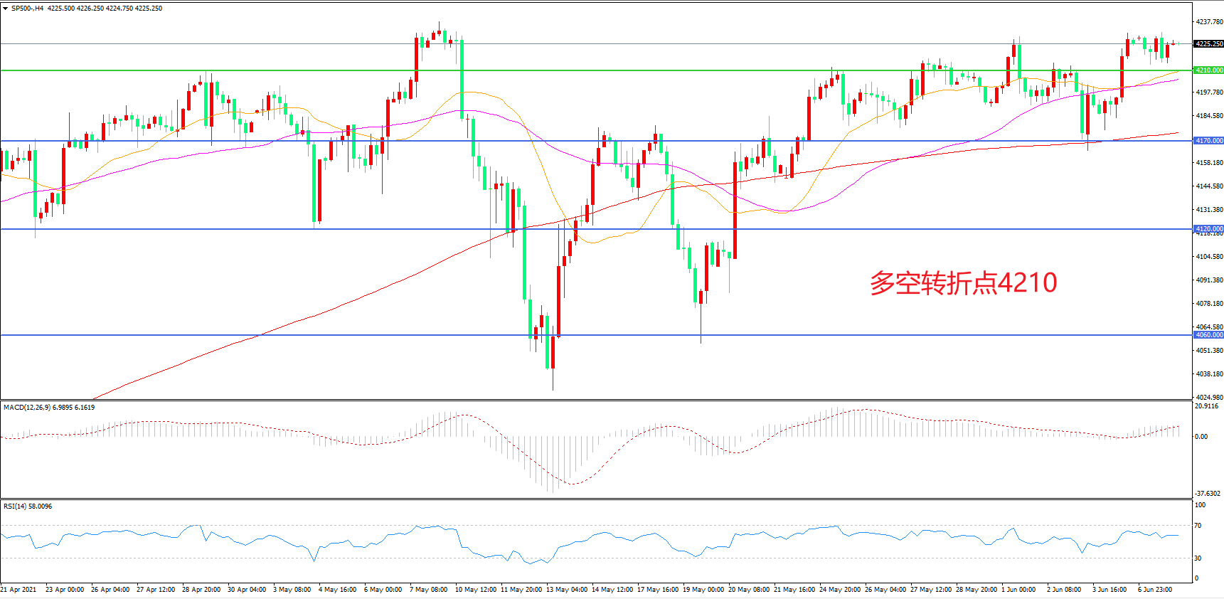4小时图看,标普500延续高位震荡,整体表现较强,4210成为短期多空分水岭,均线系统成为下方支撑,MACD红柱增加,RSI指标走平,日内震荡上行概率较大。